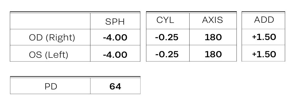 Your RX prescription for eyeglasses will normally look like this:
