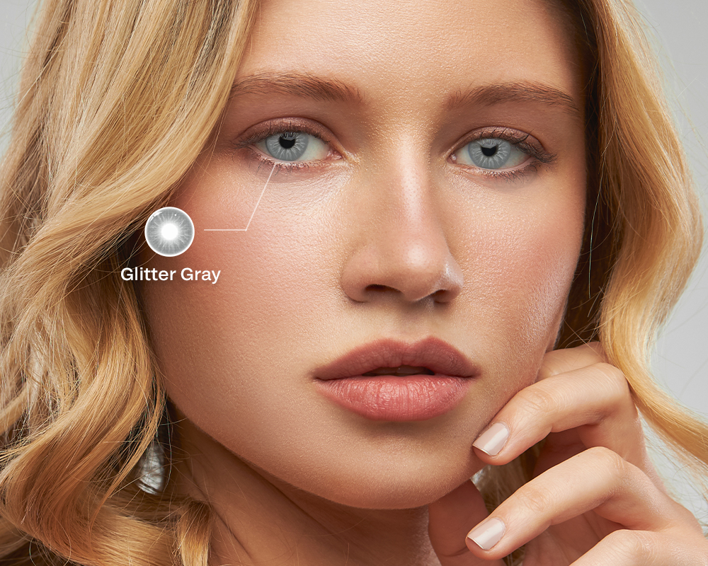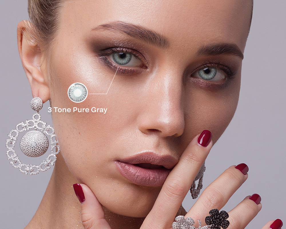 Contact lenses within this look stay in the same restrained palette. Gray-blue, ash gray and smoky ice tones subtly echo the makeup while keeping the overall effect balanced. Paired with thin eyeliner and softly blended shadows, these lenses enhance light reflection and give the eyes a clean, polished appearance.